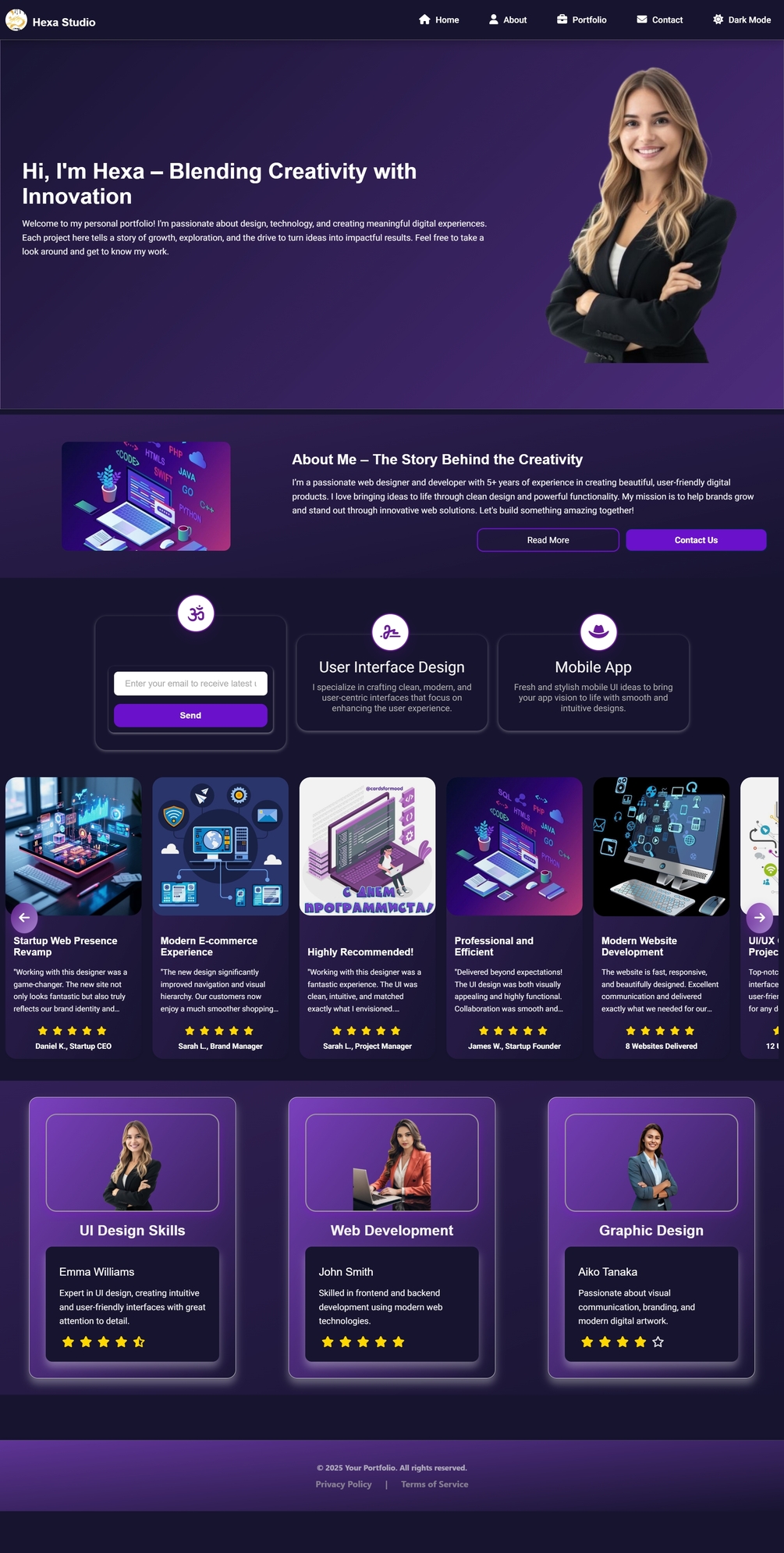 - Mode Gelap (Dark Mode): Tampilan elegan dan profesional, tersedia untuk portofolio dan admin